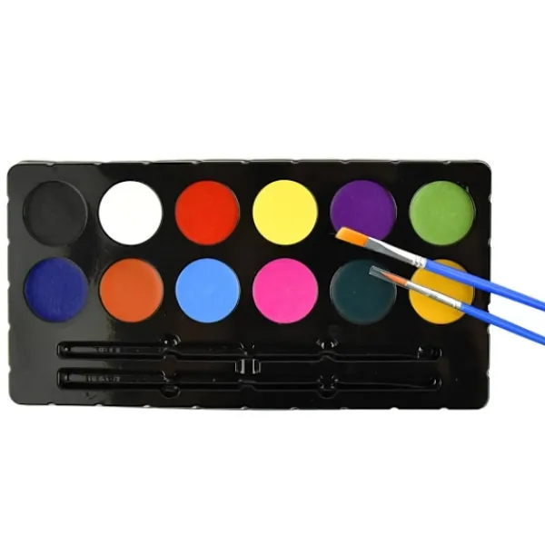 Innehåll: 12 ansiktsfärger 3g/färg och 2 borstar.