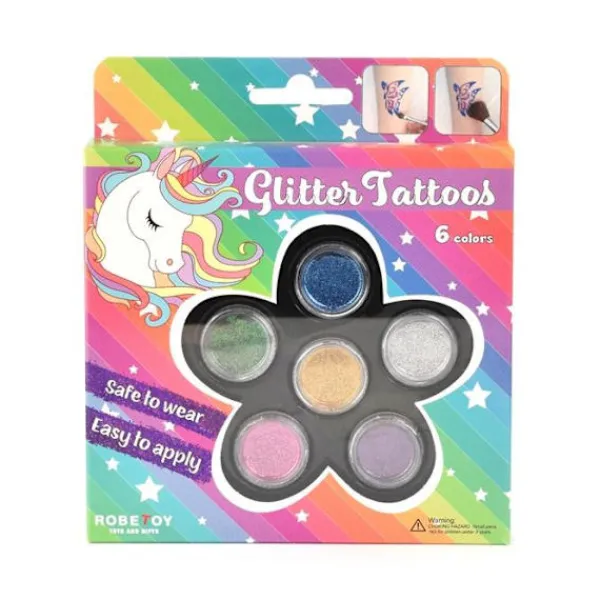 Set för att göra egna glittertatueringar. Välj en design och fäst den på huden. Applicera limmet och strö sedan över glitter med borsten. Setet innehåller glitter i sex färger: silver, lila, blå, guld, rosa och grönt.