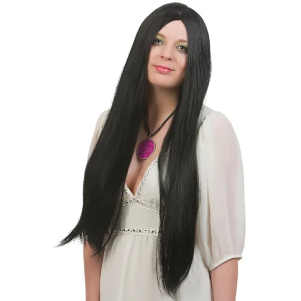 Peruk med långt svart rakt hår. Storlek: Vuxen (men kan användas på barn, om man fäster upp lite). Passar perfekt under ex. Halloween.