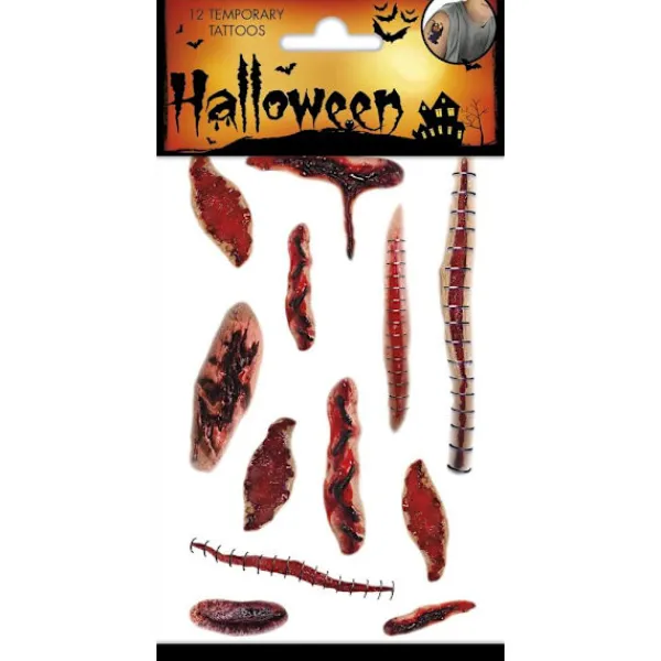 Tatueringar med Halloween-tema med olika sår. Tillfälliga tatueringar som fästes med vatten och tvättas bort när du tröttnat på dem. 12 olika tatueringar.
