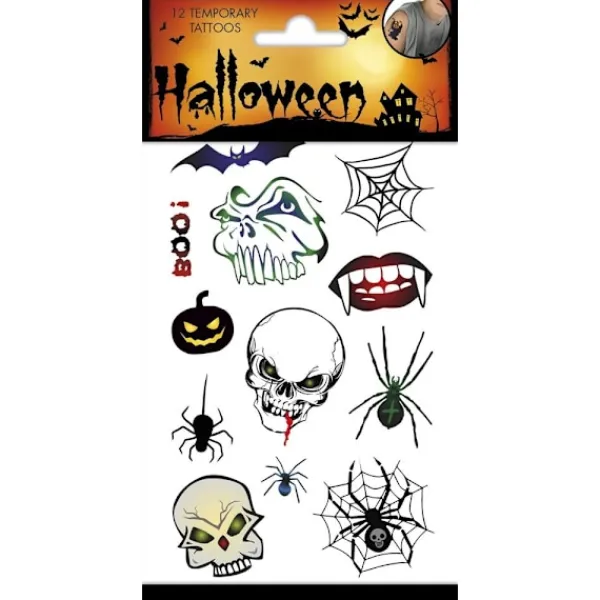 Tatueringar med Halloween-tema, spindelnät, dödskallar mm. Tillfälliga tatueringar som fästes med vatten och tvättas bort när du tröttnat på dem. 12 olika tatueringar.