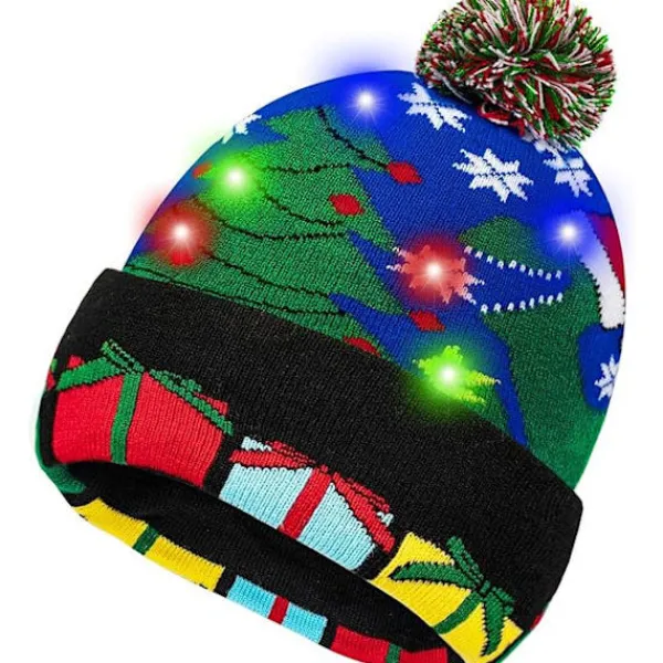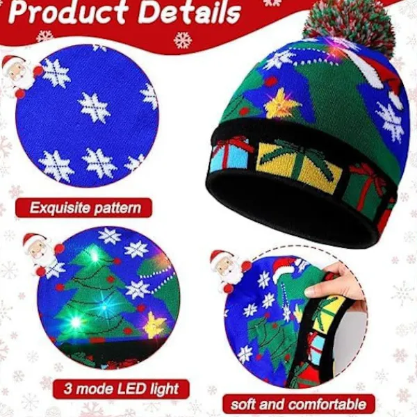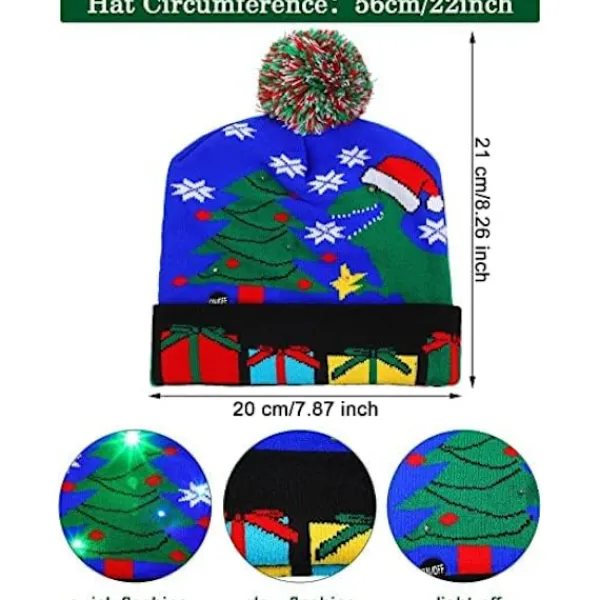 【En Storlek Passar Alla】: Varje lysande julhatts storlek är 22x25cm/8.6×9.8in. Unisex LED-vintermössa stickad mössa är lämplig för barn, vuxna, män och kvinnor. Den stickade julmössan med LED har bra elasticitet, den kommer att sitta tätt, utan att kännas för tight eller lös.