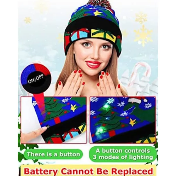 【Lätt att Tända】: Det finns en dold strömbrytare (ON/OFF) inuti sömmen på LED-julhatten, tryck bara på strömbrytaren så blinkar ljuset. Den lysande julhatten har 3 olika ljuslägen, inklusive fast, blinkande och alternerande mönster, varje tryck kan växla en inställning, det fjärde trycket kan stänga av ljusen.