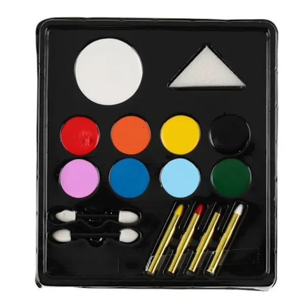 Färgerna är mjuka och lätta att arbeta med, vilket gör det enkelt att skapa både stora ytor och små detaljer. De passar utmärkt för kalas, halloween, teater eller lekfulla eftermiddagar hemma. Alla färger kan enkelt tvättas bort med vatten och mild tvål.
