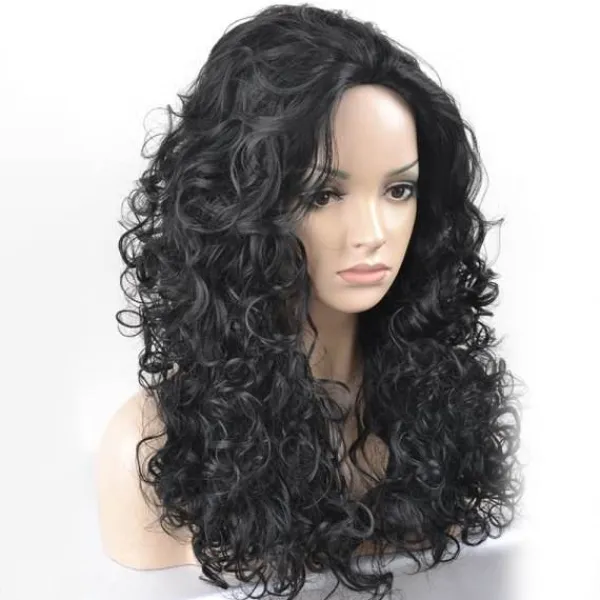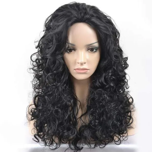 Damkarneval eller halloween-peruk med enorm volym – det lockiga svarta håret med ljusare bruna höjdpunkter har en perfekt längd och en mittbena.