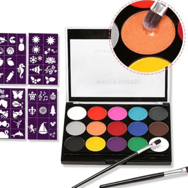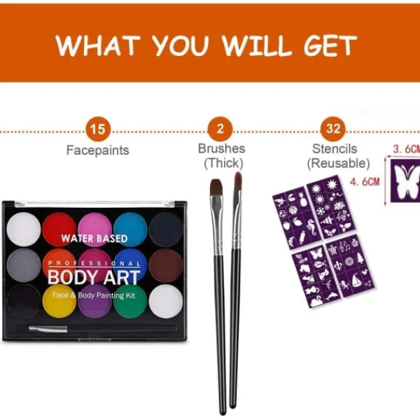 1. Ett perfekt set Det finns 15 färgglada ansikts- och kroppsfärger, 32 återanvändbara schabloner och 2 professionella målarpenslar i paletten som fritt kan blandas för att skapa levande effekter.