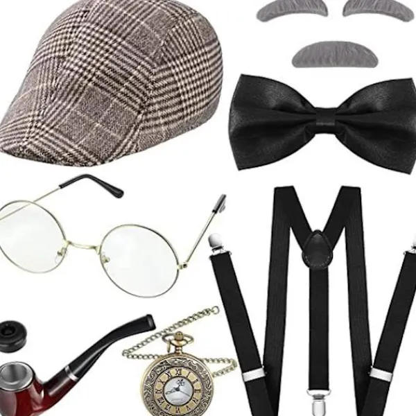 3. Du får en elegant hatt, rutig väst, falska glasögon, stilig fluga, elegant käpp, fin visselpipa, justerbara hängslen, hudvänligt skägg och ögonbryn. Västarna, hattarna och flugorna är av så bra kvalitet att du kan bära dem till andra fester än bara temafester.