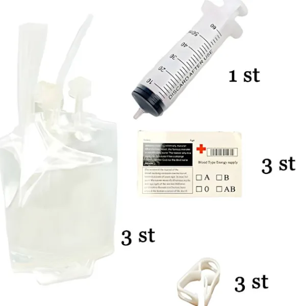 - Paketet innehåller 3 blodpåsar med slang (400ml), 3 klämmor, 3 klistermärken och en påfyllnadsspruta.