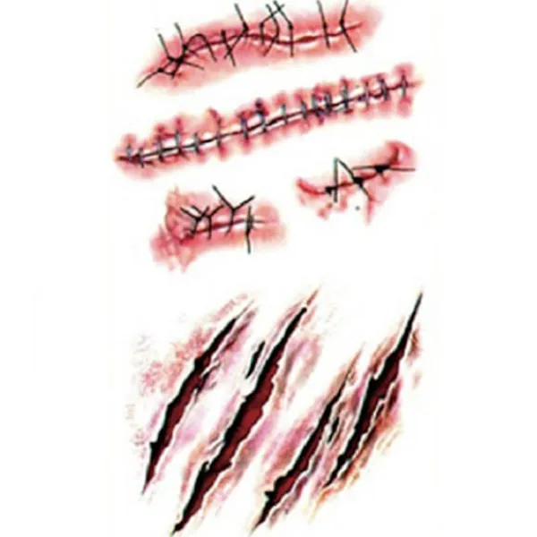 - Skapa en skräckinjagande look med dessa otäcka engångstatueringar – blodiga sår och rivsår för den perfekta hemska stilen.