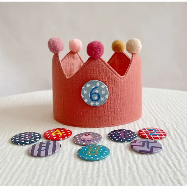 Komplett födelsedagsuppsättning: Denna muslin-krona med söta pom-poms kan dekoreras med rätt nummer varje år – fäst bara knappen så är du klar! Passar även syskon