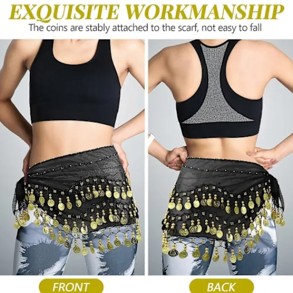 rDetta är en höftscarf i chiffong med 128 dinglande mynt. Den kan ge ett ljuvt ljud när du skakar din kropp. Mynten är tätt fastsydda på scarfen, mycket svåra att falla av om den används korrekt. Den är perfekt för magdans och andra danser.