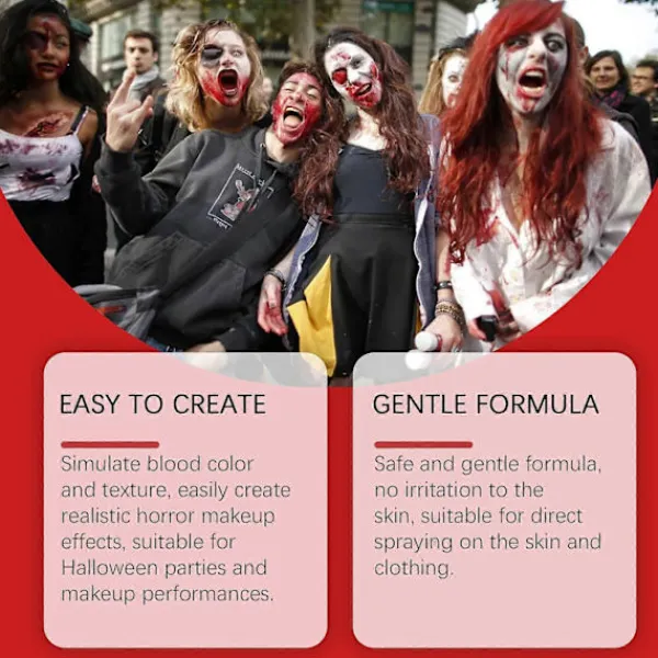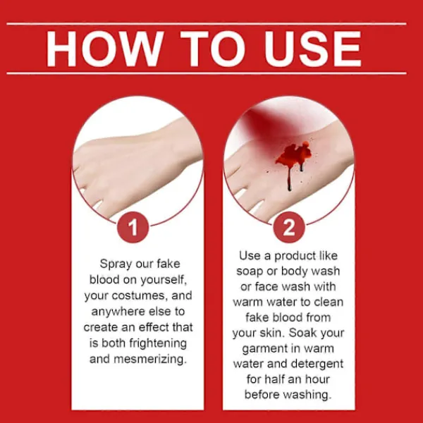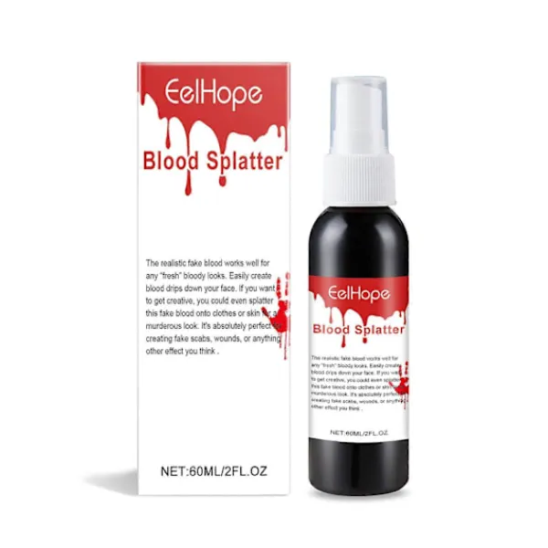 Vår plasmaspray innehåller glycerin, karbomer och propylenglykol. Den kan simulera blodets färg och textur och enkelt skapa realistiska skräckeffekter, lämplig för Halloween-fester och sminkshower. Användningen är enkel: 1. spraya vårt falska blod på dig själv, din kostym och var som helst annars för att skapa en effekt som är både skrämmande och charmig; 2. Använd produkter som kroppstvätt eller varmt vatten för att rengöra blodet från din hud. Blötlägg kläder i varmt vatten och tvättmedel i en halvtimme innan tvätt. Snabbtorkande, klibbar inte. Snabbt formad efter sprutning, det är inte lätt att fläcka andra ytor efter torkning och håll sminkningen hållbar och komplett.