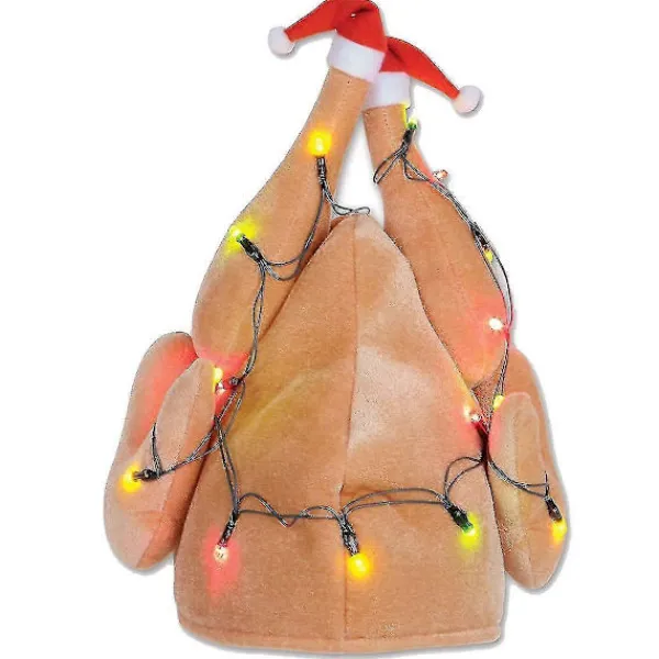 Tillverkad av ett mjukt plyschmaterial med små tomtehattar på varje kalkonben. Det finns riktiga flerfärgade lampor runt plyschhatten. Kräver 2 AA-batterier som inte ingår. När batterierna är i behållaren och strömbrytaren är påslagen tänds lamporna.