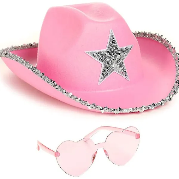 Rosa cowboyhatt – Rosa cowgirlhatt är ett fantastiskt tillägg till cowgirlklädseln. Hattarna levereras med ett snöre fäst så att du kan dra åt under hakan så att den sitter bekvämt. Paljettstjärnan gör den mer iögonfallande och stilren. Tillverkad av högkvalitativt material, den är lätt att bära och den är en rolig festgåva för födelsedagsfester, dekorationer för västernfester och rekvisita till din fotobås.