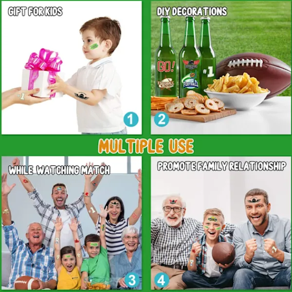 1. Fantastiska tillfälliga tatueringar med fotbollstema för barn. 2. Tillfälliga tatueringar med fotbollstema för barn och vuxna. 3. De briljanta tillfälliga tatueringarna är perfekta för fotbollskalas, födelsedagsdekorationer, festartiklar, fotbollsmatcher, DIY-dekorationer och så vidare. 4. Rekommenderar att du klistrar dessa söta tatueringar på ditt ansikte eller kropp medan du tittar på fotbollsmatcher, vilket kommer att ge mer glädje till denna speciella dag! 5. Lätt att skala av och fästa.