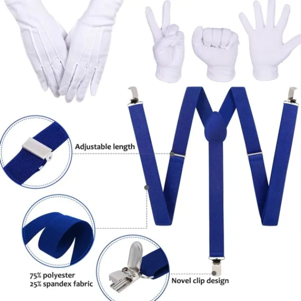 【MATERIAL】 Kepsen är gjord av mjuk och lätt bomull medan mustascher är gjorda av konstfiber, hängslen 75 % polyester 25 % spandex, handskarna är gjorda av andningsbart nylon, akrylplastknappar.