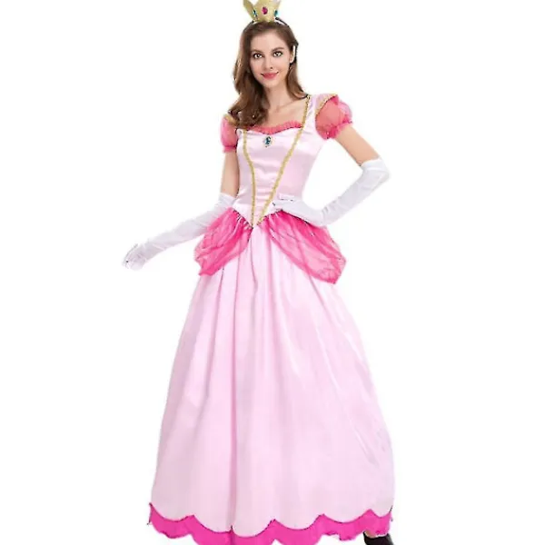 Dam Super Mario Peach Cosplay Kostym Rosa Prinsessklänning + Handskar + Huvudbonad Outfit Set Karneval Party