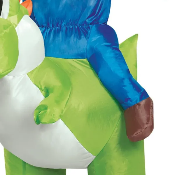 Denna dräkt är perfekt för att återuppleva Luigis och Marios äventyr från världens mest sålda plattformsspel. Skörda äpplen, bekämpa dina fiender eller samla mynt med denna nya, roliga uppblåsbara dräkt som ger illusionen av att Mario rider på Yoshi! Inkluderar uppblåsbar overall med falska ben och batteridriven fläkt (skjorta, mustasch och hatt ingår inte).