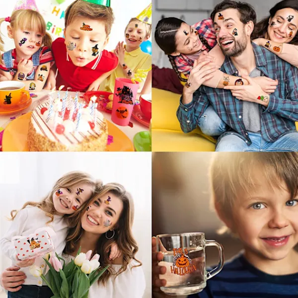 【Tattoo Kids】 10 ark. En mängd olika mönster finns tillgängliga för barn att välja mellan och dela med barn. Ett paket kan tillgodose alla dina behov, barnens favorit Halloween-element, inklusive katter, pumpor, monster, snöston, etc. män, häxor, skelett, spindlar, pumpor, etc. 【Säkerhet】 Hållbara och levande färger gör barn roligare för alla åldrar, tillfälliga tatueringar är gjorda av högkvalitativt och säkert papper, icke-allergiskt, giftfritt och helt säkert för barns hud. Sådana perfekta tillfälliga tatueringar, kroppssminkningstillbehör kan matcha din Halloween-festdräkt väldigt bra. 【Hudvänligt material】 Tillverkat av giftfri vattentät plast, hudvänlig, vattentät och svettsäker, lätt att applicera och håller i flera dagar trots tvätt, dusch eller bad! Använd bara tatueringen och fäst den på din kropp, fäst tatueringen på din favoritplats, händer, ansikte och armar. Tatueringen varar 3 till 5 dagar. 【Halloween-tatueringsdekoration】 Glow in the dark halloween-tatueringsklistermärken för barn är bäst för mörka halloween-festdekorationer. De är en stor hit i barnfödelsedagsfester och barn skulle älska att spela det på händer och ansikte, väldigt roligt!