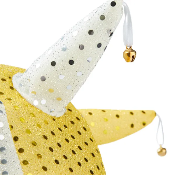Gycklarhatten med bjällror känner man igen på långt håll tack vare ljudet. Med färgerna vitt och guld, många glittrande prickar och sju horn är den dessutom ett blickfång. Med narrhatten med bjällror går det galet och klangfullt till på alla fester.
