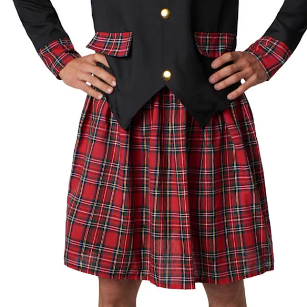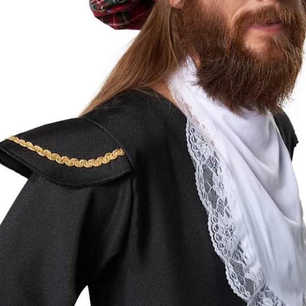 Herrdräkten Förnäm skotte består av en kilt med resår och knästrumpor med rosetter samt en långärmad kavaj med axelklaffar, gyllene knappar och kardborreband. De antydda fickorna samt uppvikta ärmarna är rutiga, axelklaffarna är guldprydda. Den stora spetskragen fästs med kardborreband. En mössa med resår i rutigt mönster rundar av dräkten, material: 100 % polyester.