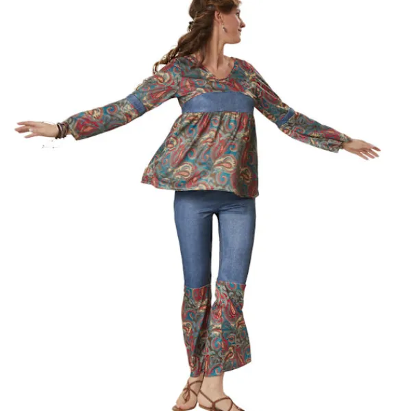 Damdräkten Hippie Girl Harmony består av långa jeansliknande byxor med resår. Under knäna finns påsydda utställda delar med färgglatt blommönster. Överdelen med något djup urringning består av samma blommönster med en jeansliknande insats runt om. Mönstret återkommer även i de långa trumpetformade ärmarna. Denna outfit rundas av med ett pannband med ornamentmönster och resår, material: 100 % polyester.