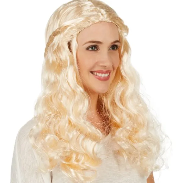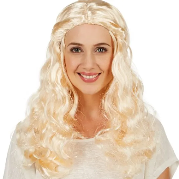 Peruk Medeltida Hovdam har underbart vackra långa lockar och två hopknutna flätor baktill, hårlängd: ca 50 cm, material: 100 % polyester.