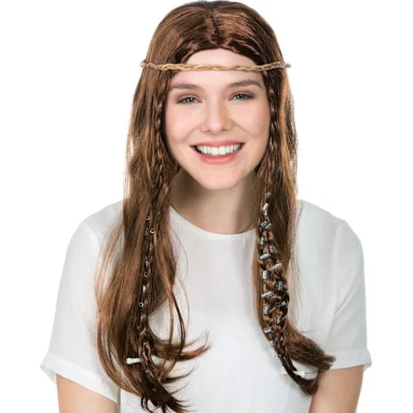 Peruk med långt hår, med 4 små tofsar och pärlor samt små ben som dekoration, längd: ca 50 cm, material: 100 % polyester.