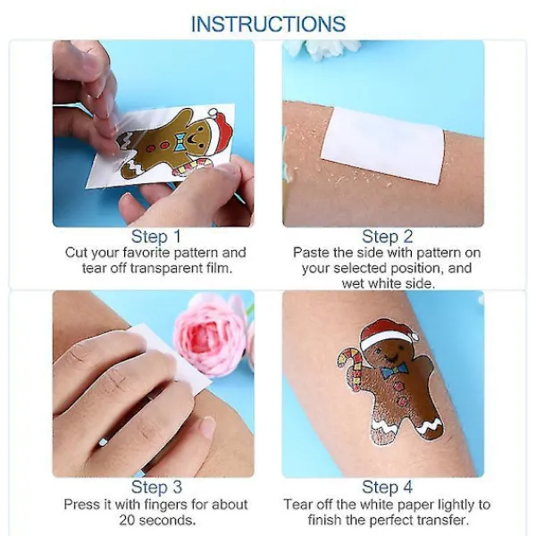 DescriptionThis item includes 72 pcs of self-adhesive stickers in 18 patterns intotal. The patterns are Christmas themed such as Santa Claus, reindeer, snowflake, snowman, jingle bell, Christmas tree, Santa hat, gingerbread man and more. The style is lovely with attractive colors and patterns. Its easy to stick and can maintain for a longer time. You will have a memorable and funny Christmas party time with it.Features- Brand: TINKSKY- Color: Shown in the pictures- Material: Transfer paper- Size: Approx. 5.5 x 5.5 x 5.5 cm/ 2.16 x 2.16 x 2.16 inch (LxWxH)- Self-design and lovely Christmas Decorations to increase feast fun.- Diverse Design: 18 different types in 4 sets, which includes Santa Claus, reindeer, snowflake, snowman, jingle bell, Christmas tree, Santa hat, gingerbread man and more, enough patterns for your options.- Practical and Convenient: Long-lasting viscosity. Not easy to remove it even when bathing.- Great Gift Choice. It is suitable for parents to give children as gifts or to exchange gifts between children.- Wide Application: Waterproof and sweat-resistant, can be used on: skin, pottery, metal, glass and so on.- Application Method: Select your desired pattern. Tear off the paper. Stick the front of pattern on your skin. Use a damp cloth or sponge gently wipe the stickers until wet, keep pushing forcibly about 20S or so.- Cleaning method: Rub gently with a lotion, BB oil or alcohol until the completely disappear, then you can remove the pattern of paper.- Precaution: Users with sensitive skin should use cautiously. Do not use on wound side.- Key tips below:1. Before opening the backing paper, please wipe the sticker gently with a damp cloth or a sponge until it is completely wet. Do not rub until the pattern is dry