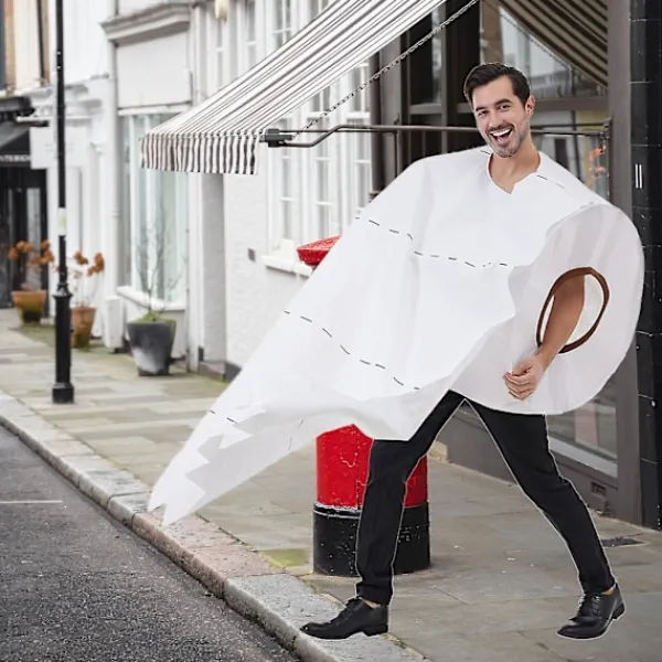 1. Denna toalettpapperskostym är en cylindrisk helkroppsdräkt gjord av skum, tyg och ironi.