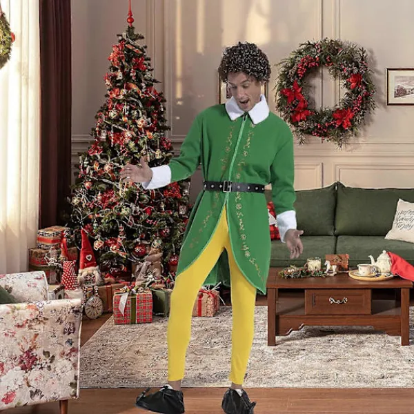 Inkluderar: Bälte, Jacka, Byxor, Hatt och Skoöverdrag. Har en långärmad grön tunika med vintermönster, vit fuskpälskant, svart bälte och gula tights.