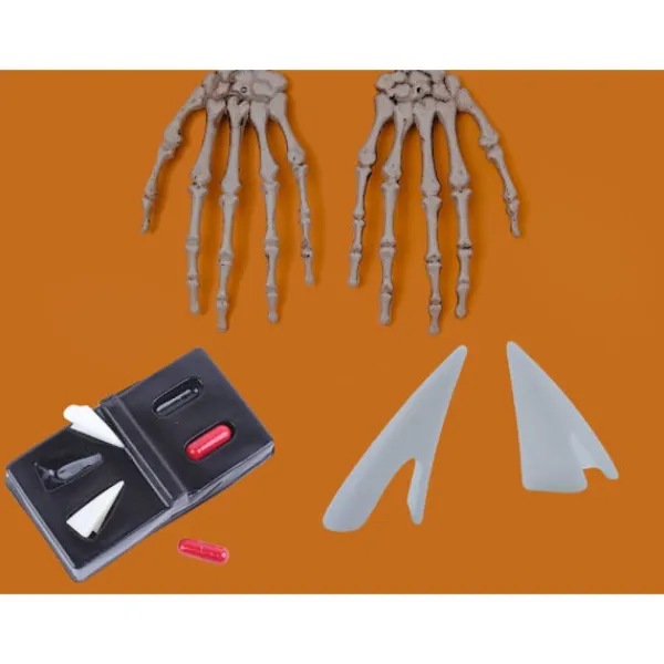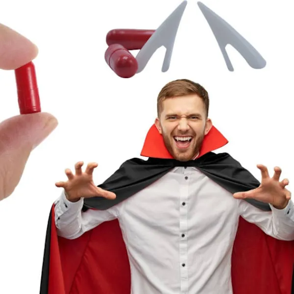 Vampyr/Varulv-setet innehåller falska tänder och speciellt utformat konstgjort blod, perfekt för en realistisk och effektiv förklädnad. De falska tänderna är gjorda av material som imiterar riktiga huggtänder, vilket ger karaktären en mörk och skrämmande aura.