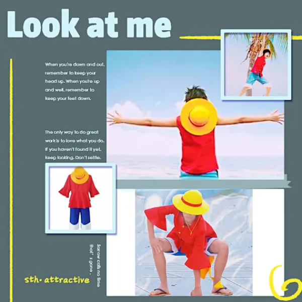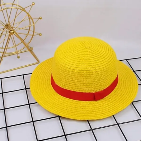 Lufys halmhattsdesigninspiration: Oavsett var han är bär Lufy sin halmhatt genom absolut allt, även om hatten i början var benägen att slås av huvudet, vilket tvingade Lufy att antingen lägga undan den eller få någon att hålla i den under slagsmål. Från Arabasta Arc och framåt har han fått en snörrem till den, som syddes på av Nami, vilket gör att hatten kan hänga runt halsen under slagsmål. Han hade också en dekorativ halsduk lindad runt sin halmhatt. Så vår halmhatt föddes.