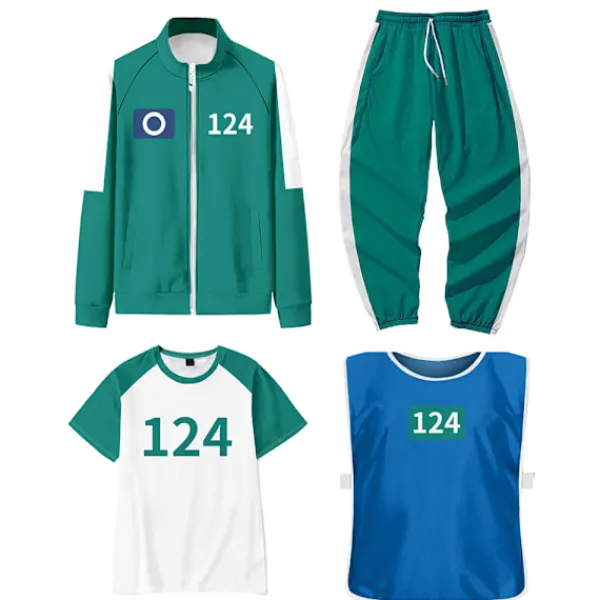 Squid Game-inspirerat sportklädesset: Detta 4-delade set inkluderar en jacka, långbyxor, kortärmad T-shirt och linne, alla designade med det ikoniska Squid Game-temat för ultimat fan-appeal.