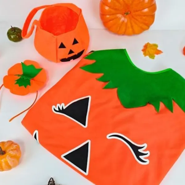 PAKETLISTA – Halloween-pumpadräktsetet innehåller 1 pumpaponcho, 1 pumpapannband och 1 godisväska. Oavsett var du befinner dig kan du enkelt dra denna poncho över vilken outfit som helst för att omedelbart skapa en festlig halloweenatmosfär.
